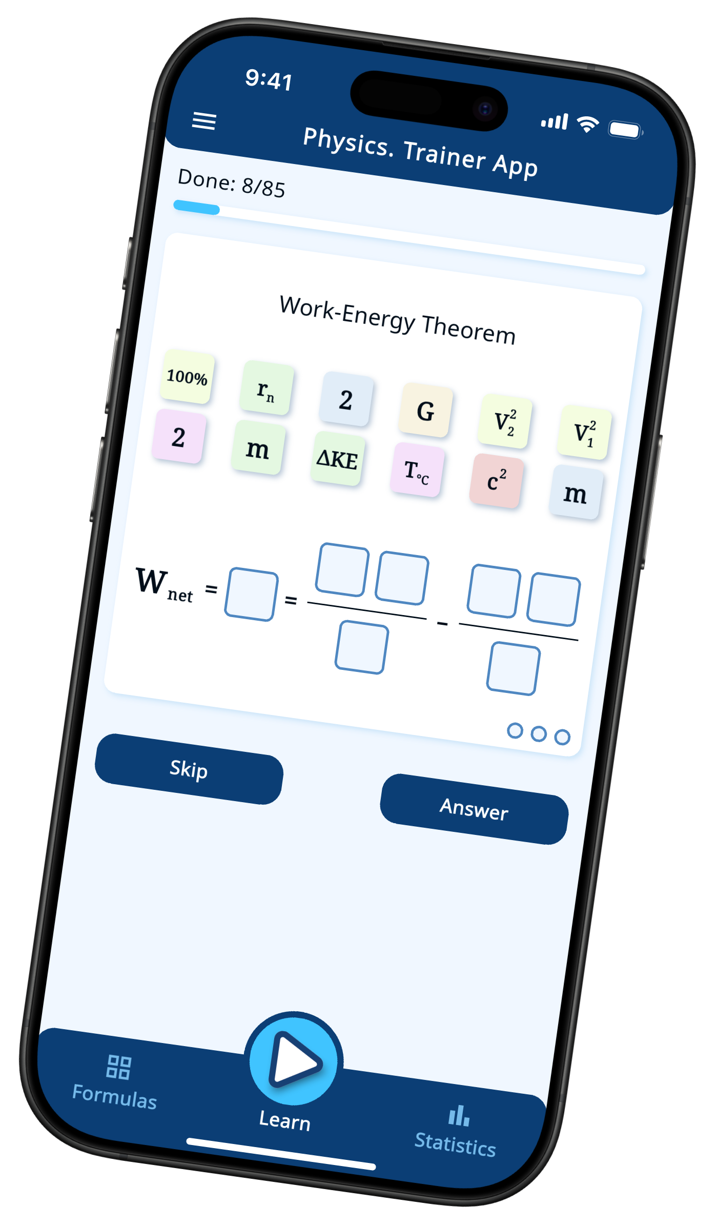🎓 Trainer Mode – Practice with spaced repetition and adaptive learning to memorize formulas faster. Drag and drop physical quantities, build the formula, and lock it into memory. Got it wrong? Flip the card and try again. Customize the number of repetitions in the app settings.